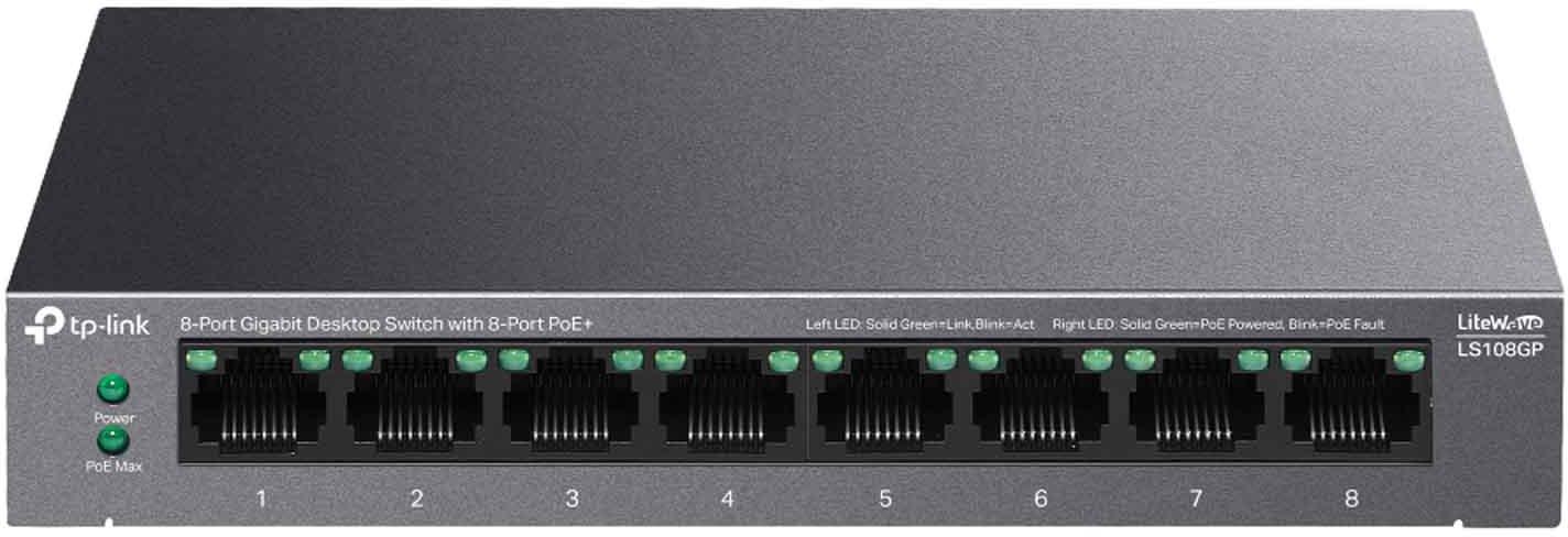 TP-Link LS108GP to niezarządzalny switch LiteWave typu desktop, wyposażony w 8x gigabitowych portów 10/100/1000 Mb/s PoE+. Wszystkie porty obsługują automatyczną negocjację szybkości połączeń i automatyczne krosowanie Auto MDI/MDIX.