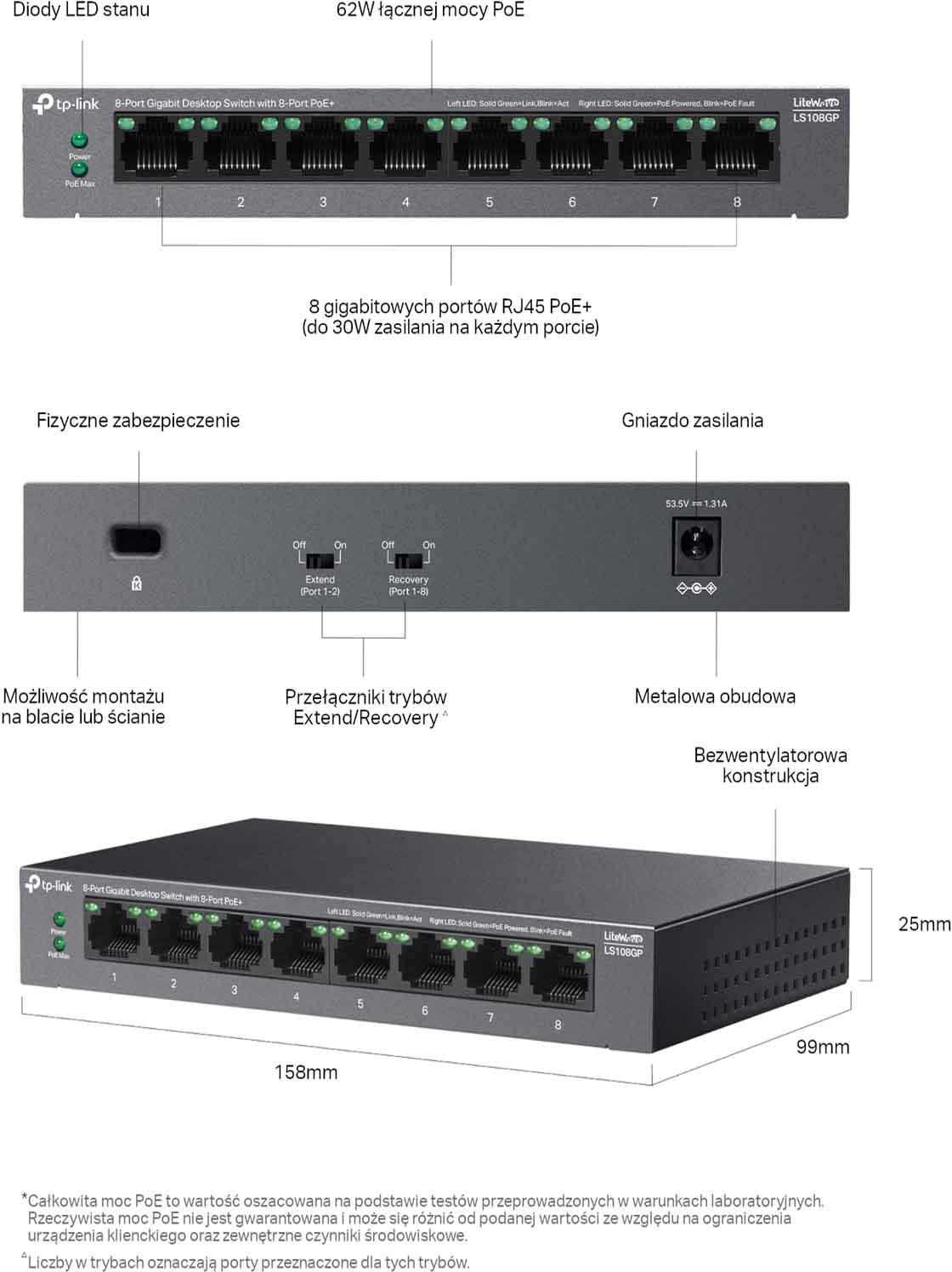 - 8x portów 10/100/1000Mb/s PoE+ (automatyczna negocjacja szybkości połączeń, automatyczne krosowanie Auto MDI/MDIX)
