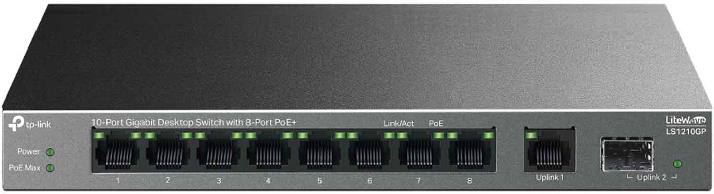 TP-Link LS1210GP to niezarządzalny switch LiteWave typu desktop, wyposażony w 9x portów Gigabit Ethernet 10/100/1000 Mb/s (w tym 8x portów PoE+) oraz 1x slot SFP. Wszystkie porty obsługują automatyczną negocjację szybkości połączeń i automatyczne krosowanie Auto MDI/MDIX.