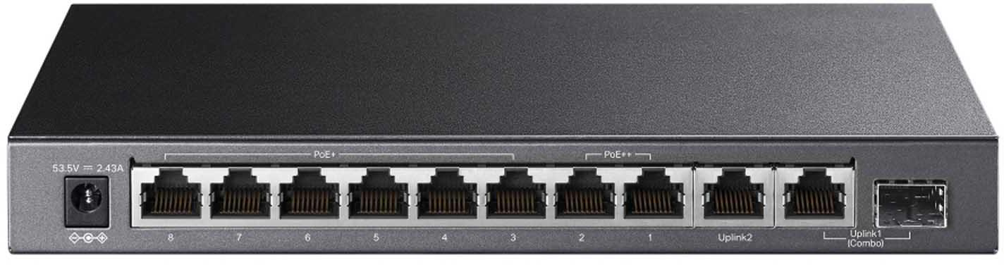 TP-Link TL-SG1210PP to przełącznik typu desktop wyposażony w 9x portów gigabitowych 10/100/1000 Mb/s (w tym 6x portów PoE+ i 2x porty PoE++) oraz 1x gigabitowy slot combo SFP / RJ45.