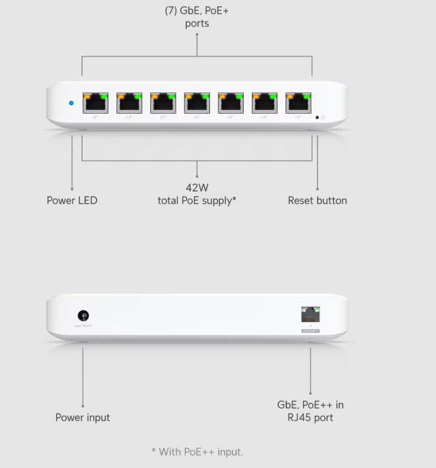 ✔ Porty: 7x Gigabit Ethernet PoE+ (30W), 1x Gigabit Ethernet z opcjonalnym wejściem PoE++