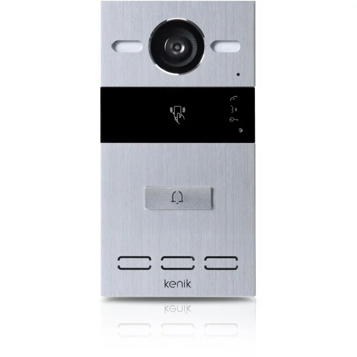 - Solidna konstrukcja panelu (wykonany z aluminium) gwarantuje trwałość i niezawodność. Czytnik zbliżeniowy zapewnia stacji bramowej KENIK dodatkową warstwę zabezpieczeń. Kamera o rozdzielczości 2MPx i szerokim kącie widzenia 110° pozwala na klarowne obserwowanie otoczenia, nawet w warunkach słabego oświetlenia, dzięki funkcji doświetlenia nocnego LED.