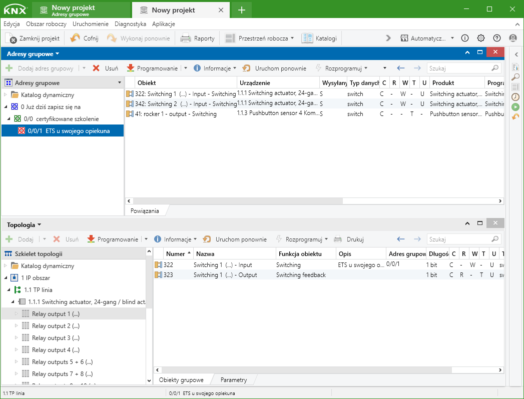 - Parametryzacja adresu fizycznego i aplikacji za pomocą oprogramowania ETS do uruchamiania KNX od wersji 4.1.8.