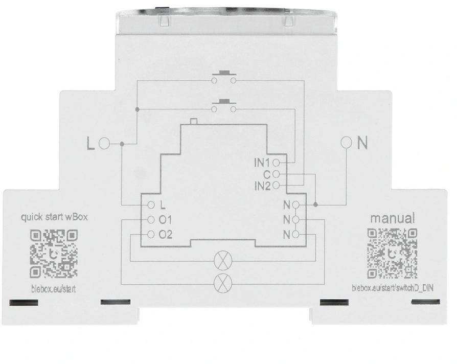 Bezprzewodowy podwójny wyłącznik 230V na szynę DIN BleBox SwitchBoxD DIN – schematy instalacyjne: