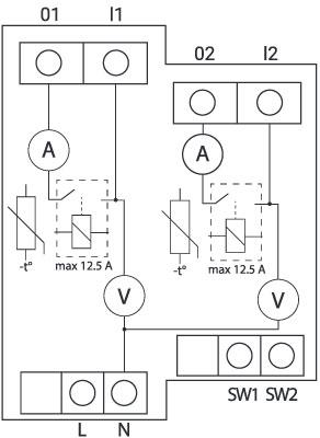 - Wejścia: 2 × przyciski/przełączniki (SW), 2 × wejścia przekaźnikowe (I), 2 × zasilanie (N, L)