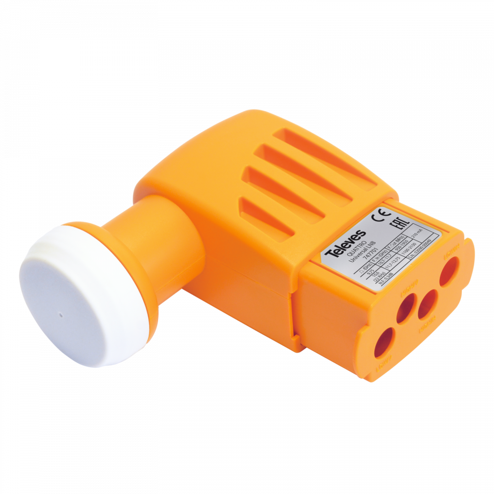 Konwerter LNB Quattro z 4 wyjściami, gdzie każde z nich posiada przypisaną stałą kombinację polaryzacja/pasmo (Hh, Hl, Vh, Vl). Każde wyjście oznaczone jest danym kolorem: czarny – Vl, czerwony – Vh, żółty – Hh i zielony – Hl.