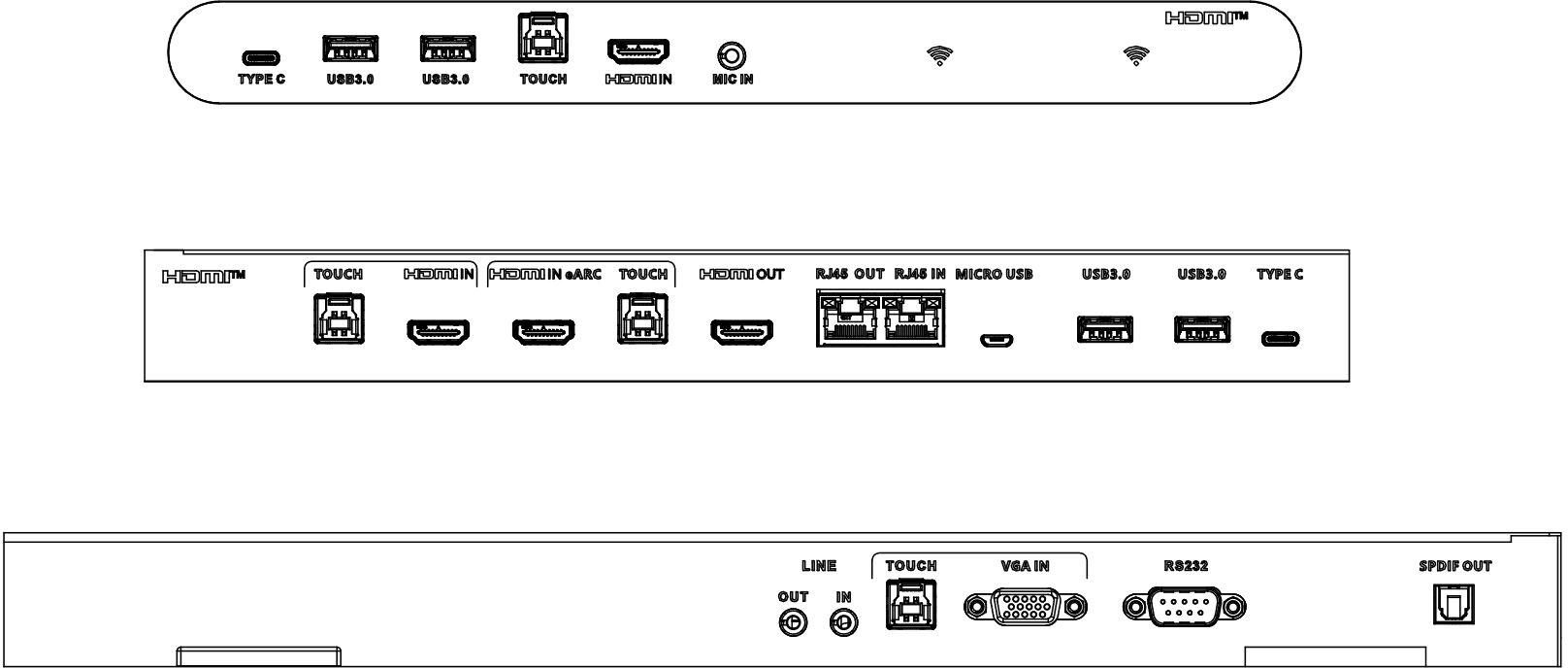 | Porty z tyłu | Typ C × 1 (4K@60 Hz, dotyk) HDMI In × 2 (4K@60 Hz) VGA In × 1 (1080p@60 Hz) USB 3.0 Typ B × 3 (dotyk) HDMI Out × 1 USB 3.0 Typ A × 2 Micro USB × 1 RS-232 × 1 RJ45 In × 1 RJ45 Out × 1 Audio In × 1 (port 3.5 mm, używany do odtwarzania dźwięku z VGA) Audio Out × 1 (port 3.5 mm) SPDIF Out × 1 (port optyczny) OPS slot × 1 |