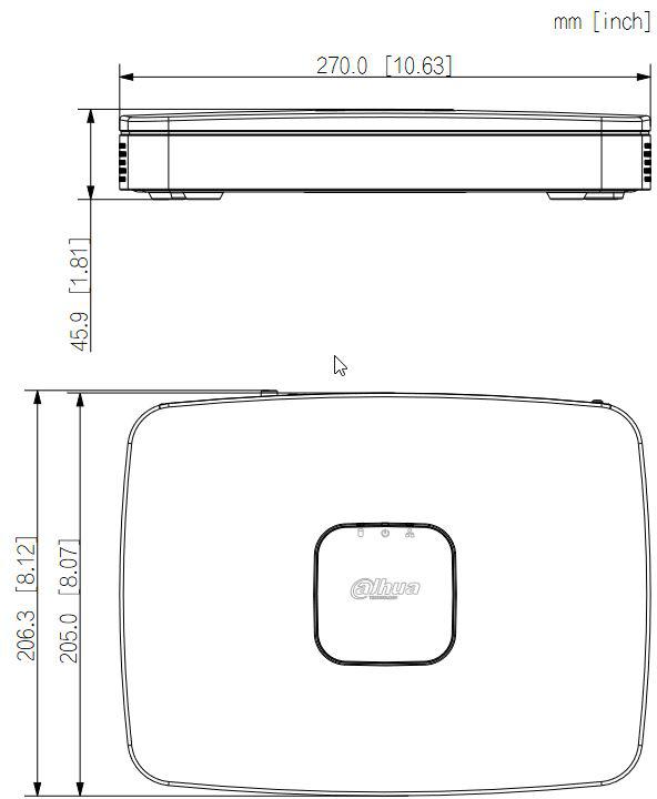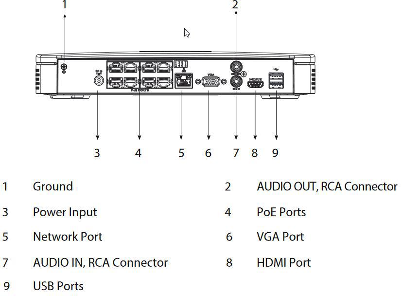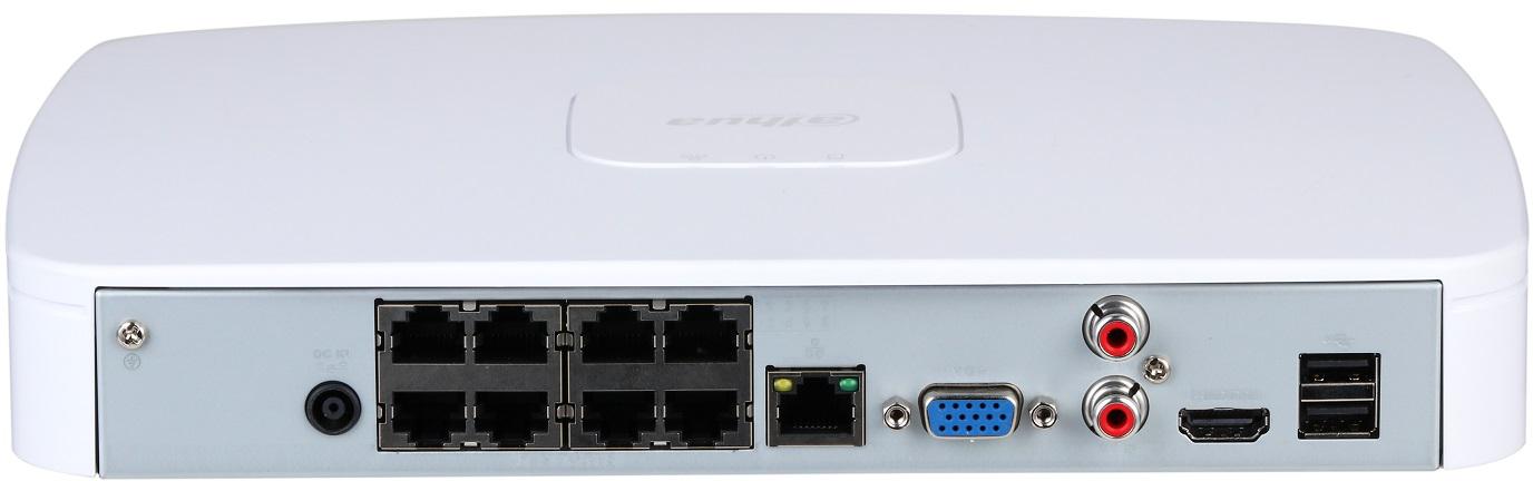 Port Wejście audio: 1 × RCA, Wyjście audio: 1 × RCA, Interfejs dysku: 1 port SATA, do 10 TB. Maksymalna pojemność HDD różni się w zależności od temperatury środowiska. USB: 2 (2 porty USB 2.0 z tyłu), HDMI: 1, VGA: 1, Port sieciowy: 1 (10/100/1000 Mbps Ethernet, RJ-45), Port PoE: 8 × porty PoE (10/100 Mbps).